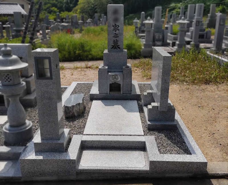 倉吉市内でお墓の移転工事を行いました。お墓本体、お地蔵様、小さな供養塔、墓前灯篭一対、ベンチなど、巻石以外を全て移設しました。