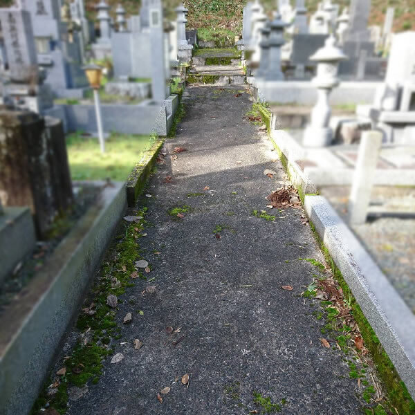 経年によって、寺院墓地のコンクリート通路にひび割れや苔が生じていました。