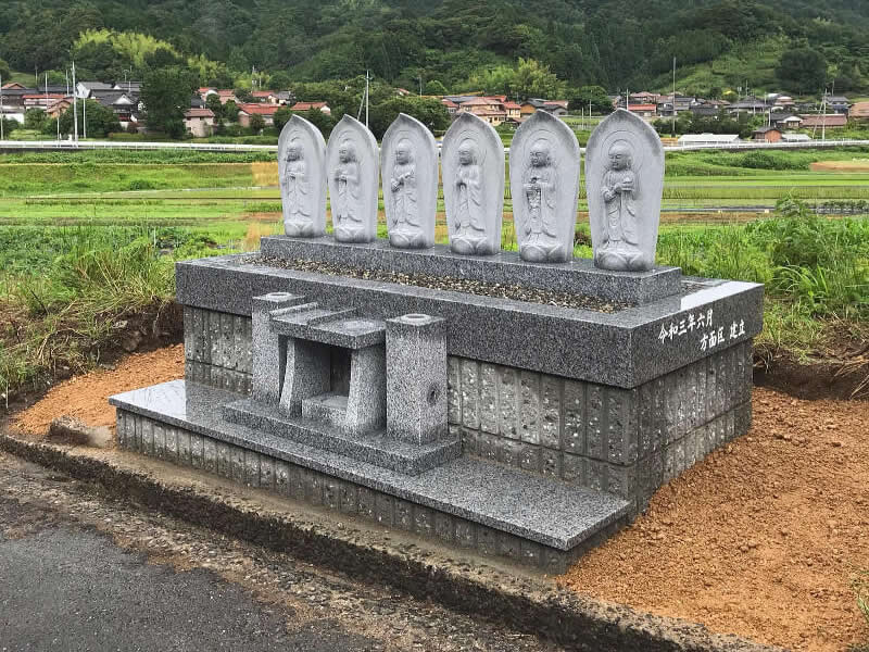 琴浦町の大山乳業農業協同組合様にて、五輪塔の移設工事をお任せいただきました。巻き石を新設して五輪塔を設置後、お参りしやすいように飛び石のアプローチも設けました。