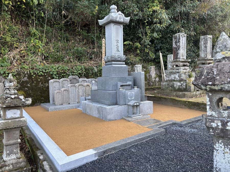 左のお墓を建て替えることになりました。併せて土間の雑草対策も行います。