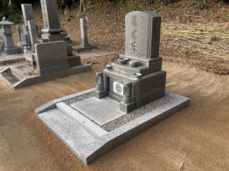 洋型のお墓です。お客様のご要望を反映させた、ボリュームを持たせた舞台が特徴です。土間部分は草の生えない防草土間仕上げとなっています。掃き掃除もしやすく、管理のしやすいお墓です。